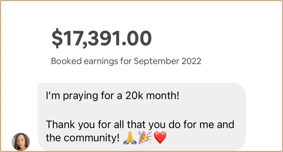 Although I have many students who made 6-figures from my materials, it would be illegal and unethical for me to guarantee your personal results. Your work ethic will determine your success. I have seen students have success as early as the same week as finishing the course.